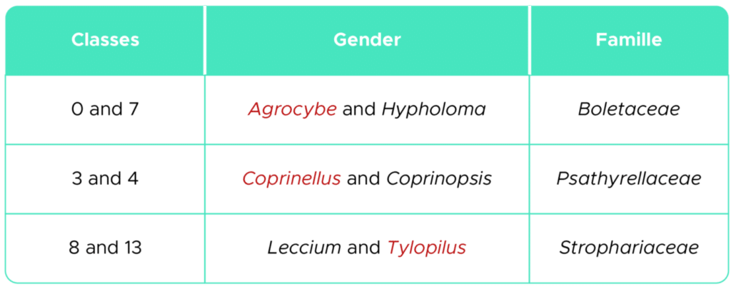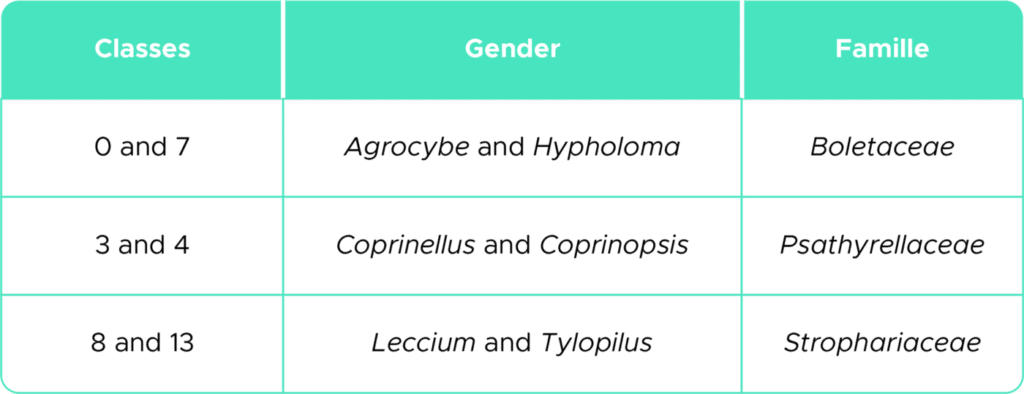One reason for the confusion of classes may be that the taxonomic identification of mushrooms is wrong. The images we use come from a web page where users classify images of mushrooms only by looking at the images and according to their experience and not according to an objective taxonomic identification protocol.