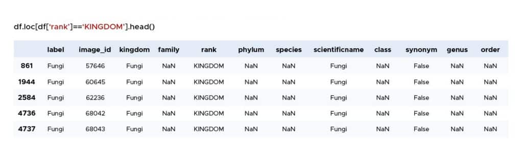 In the table 1, the `rank` column indicates the last taxonomic level reached in the mushroom identification in our data frame. Thus, if an entry has the value `KINGDOM` in the `rank` column, the `label` column value will be the most general identification, e.g., `Fungi.` The identified images can therefore belong to any mushroom.