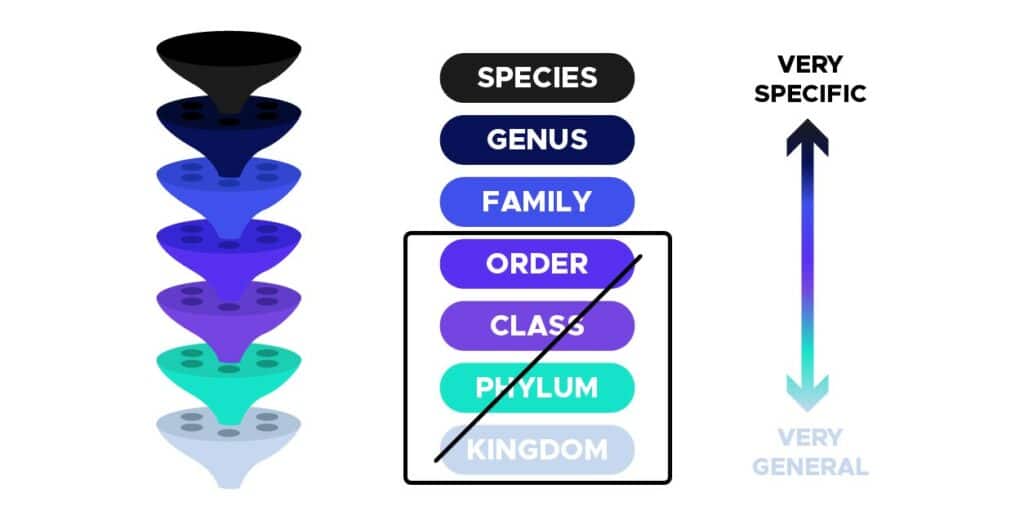The first step in processing our data was to create a data frame with information about the images and taxonomy of the mushrooms. In biology, a taxonomy is a way of defining hierarchical groups based on common characteristics, as shown in the figure below :