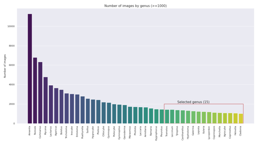 The bar chart below shows the number of images for 41 selected genus (Fig. 5). We decided to limit ourselves to the 15 highlighted genera containing ~1,000 images to reduce computation time and avoid a biased representation. With this, we have a total of 18,412 images available for the classification/modeling part of our project.