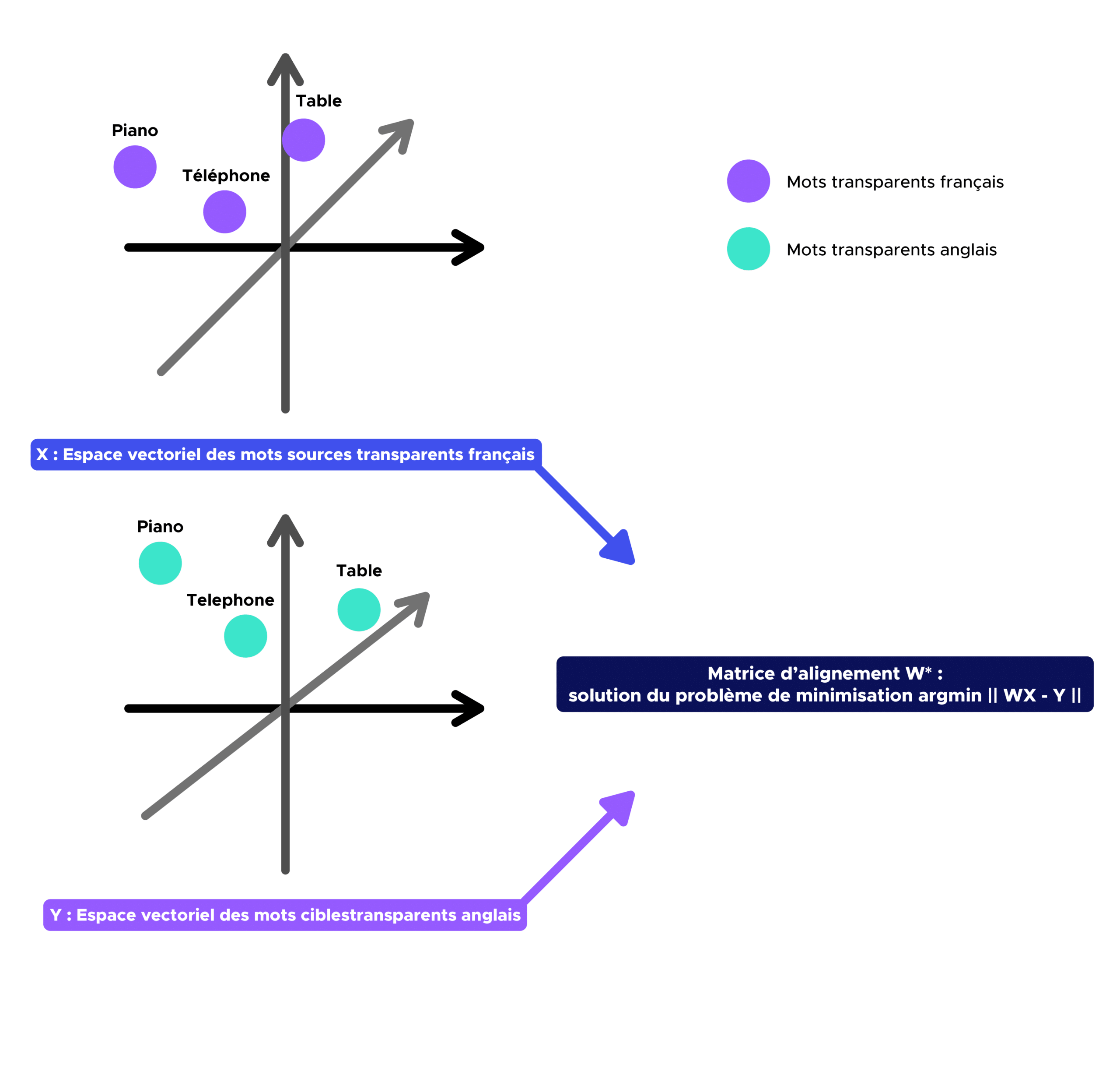 Les mots transparents vont être essentiels à la construction de l’algorithme de traduction au sens où ils correspondent à des points de repère permettant d’aligner les deux espaces vectoriels d’embeddings après application de  la matrice de d’alignement W. Autrement dit, les mots transparents vont permettre de déterminer la transformation géométrique existante entre les deux sous-espaces vectoriels.