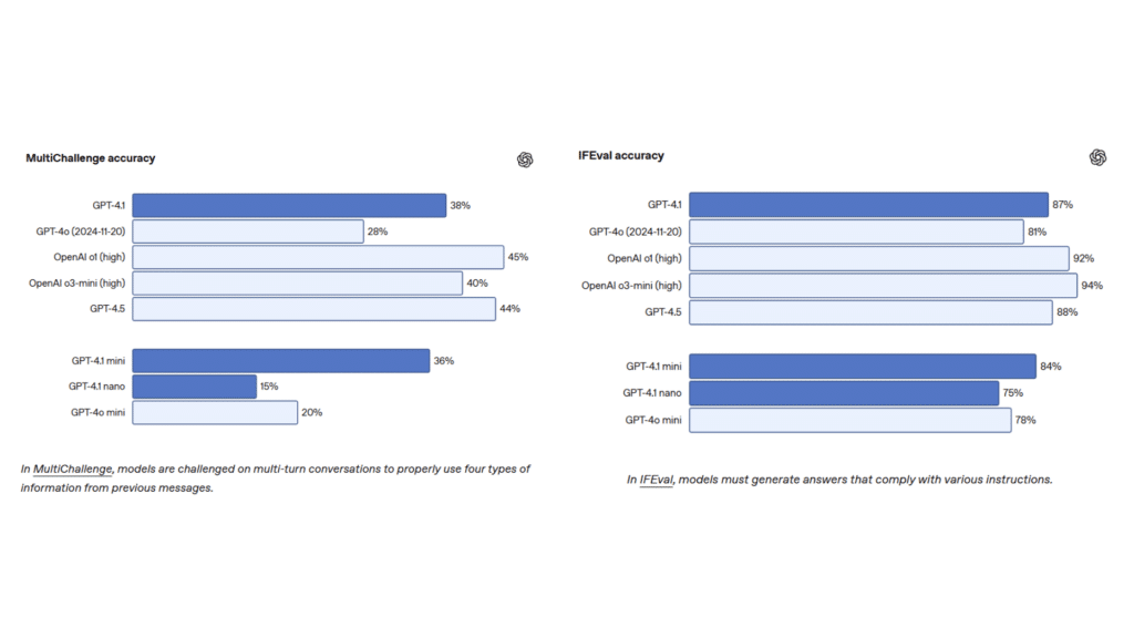 GPT‑4.1 démontre également une nette amélioration sur le suivi d’instructions complexes. Qu’il s’agisse de formater une réponse en YAML, de suivre un ordre d’étapes précis, ou d’éviter certains comportements, le modèle s’exécute avec plus de précision et de discipline que GPT‑4o. Sur des benchmarks comme IFEval ou MultiChallenge, il dépasse régulièrement la barre des 85 %, une progression qui le rend plus fiable dans des cas d’usage sensible (juridique, santé, finance…).