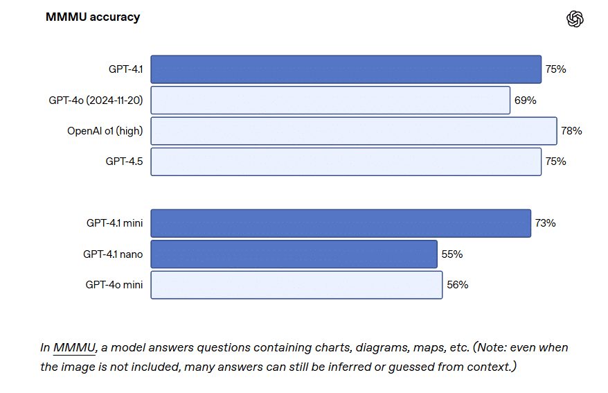 En terme de vision, GPT‑4.1 reste compétitif, avec 74,8 % sur le benchmark MMMU (compréhension d’images scientifiques, graphiques ou tableaux) et 72 % sur des vidéos longues sans sous-titres. Toutefois, il ne surpasse pas les meilleurs modèles multimodaux sur le marché (comme Gemini 2.5 Pro ou Claude 3.7). On est loin d’une révolution, mais les progrès restent tangibles pour les usages industriels.