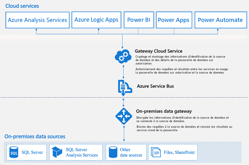 En outre, le Gateway sur site transfère les requêtes émises par les services cloud vers la source de données sur site. La requête est exécutée à la source de données, pouvant être un serveur SQL, des fichiers, un SharePoint et bien plus encore.
