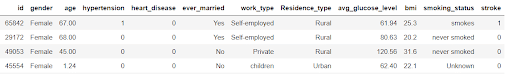 Par exemple, la personne avec l’id 29172 est une femme qui a 68 ans, qui a été mariée et qui vit dans un milieu rural, qui n’a jamais fumé et elle n’a pas eu de problèmes d’hypertension, ni de problèmes de cœur. On a également relevé son taux moyen de glycémie et son IMC.