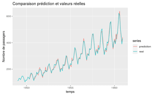 En turquoise on voit les données réelles et en rouge on a les estimations proposées par le modèle.