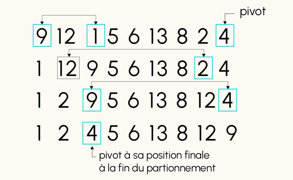 De manière itérative, la fonction de partitionnement parcourt le tableau à trier afin de comparer les différents éléments au pivot. Lorsqu’on obtient un élément plus petit que le pivot, on change la position de cet élément avec la valeur d’un élément plus grand que lui apparaissant avant lui dans la liste. Si l’on tombe sur un élément plus grand que le pivot, on ne fait rien.