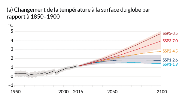 À court terme, le réchauffement de la planète va se poursuivre et devrait atteindre 1,5°C, au plus tard, au début des années 2030. Afin de prédire l’augmentation après 2030, le GIEC a modélisé plusieurs scénarios. Ces prédictions de données dépendront de nos émissions de gaz à effet de serre dans les années à venir. Si ces dernières sont faibles, il sera possible de limiter le réchauffement sous 2°C, voire 1,5°C. En revanche, les politiques actuellement en œuvre nous mènent à un réchauffement de 3,2°C en 2100. Cela signifierait un monde invivable dans de nombreuses régions et pour beaucoup d’espèces.