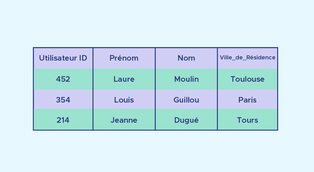 Chacune des colonnes de ces tableaux correspond à une de ces catégories et comprend un certain nombre de données de cette catégorie. Ces tableaux ont généralement un schéma fixe, c’est-à-dire qu’on définit la forme des tables (nombre de colonnes, titres, type des données et éventuellement d’autres contraintes). Voici un exemple