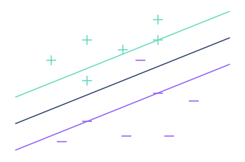 Pour rendre notre algorithme plus flexible, nous allons utiliser un seuil, qui correspond au nombre d’observations que nous tolérerons à l’intérieur de la marge. On cherche ensuite à déterminer, comme précédemment, la droite de séparation qui maximise la marge. Mais on ne se soucie plus désormais des observations qui se trouvent à l’intérieur de la marge. Cela nous permet d’obtenir une certaine insensibilité aux valeurs extrêmes.