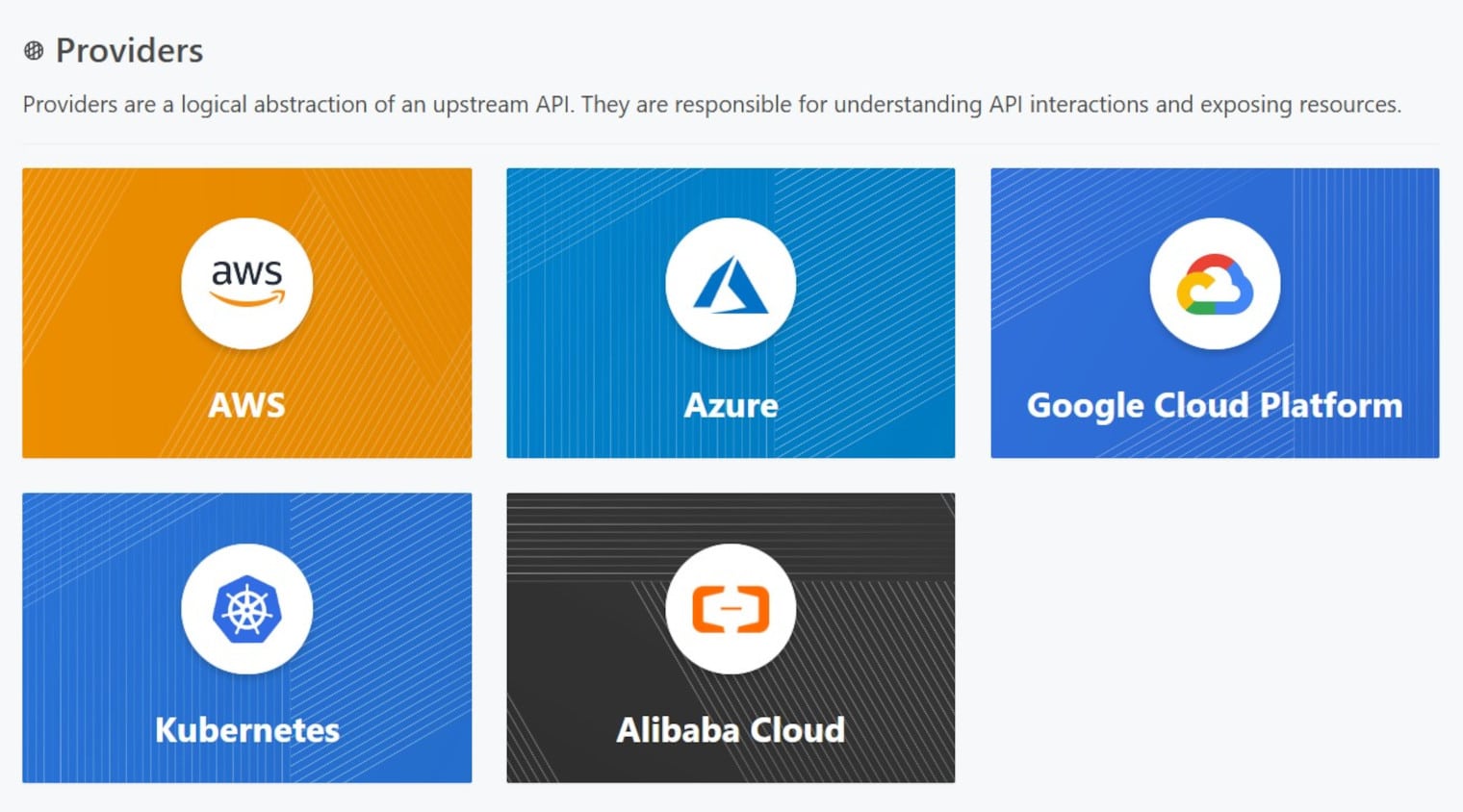 Au total, Terraform cumule plus d’une centaine de fournisseurs pour différentes technologies, et chaque fournisseur donne aux utilisateurs de Terraform l’accès à ses ressources. Par exemple, AWS offre accès à des centaines de ressources comme les instances EC2.