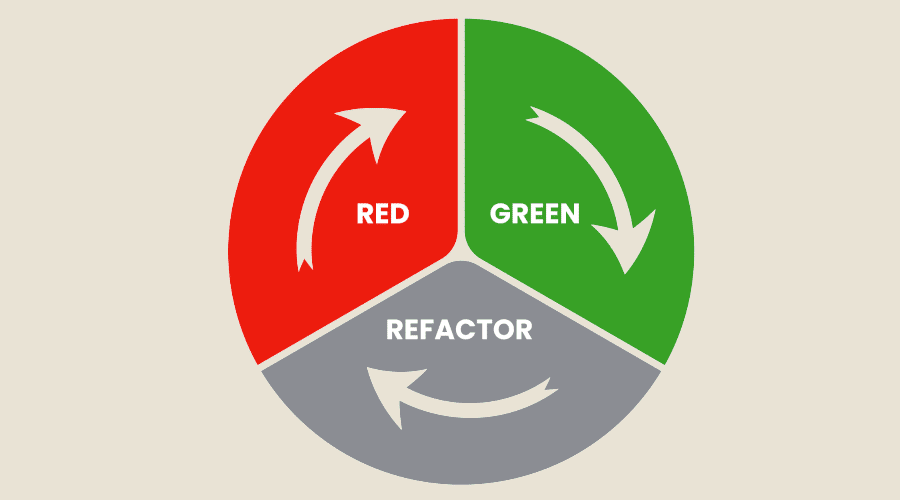 Mis bout à bout en une seule itération, ces 3 lois constituent un nano-cycle de TDD. Traditionnellement, elles se schématisent à travers un cycle en 3 phases : red (rouge), green (vert) et refactor (remaniement).