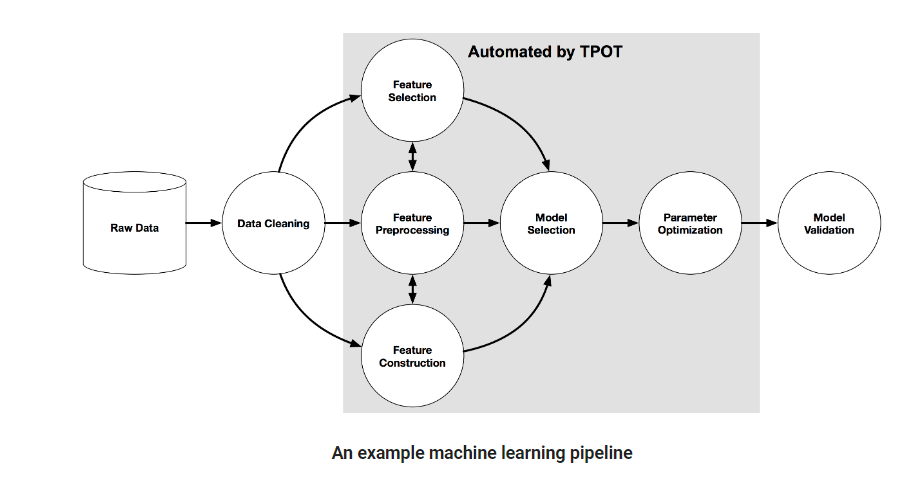 TPOT, ou Tree-based Pipeline Optimization, utilise une structure basée sur les arbres de décisions binaires pour représenter un modèle de pipeline. Ce qui inclut la préparation de données, la modélisation des algorithmes, les réglages des hyperparamètres et la sélection du modèle.